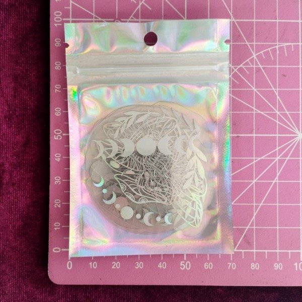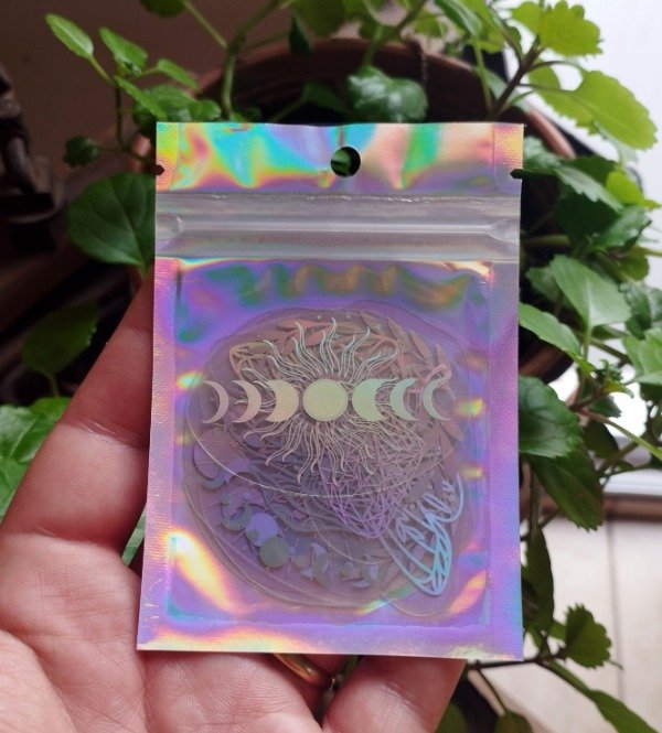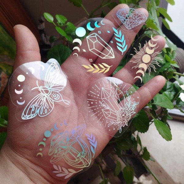 Cinco piezas de stickers holográficos con diseño mágico 🍄🔮✨💎✋