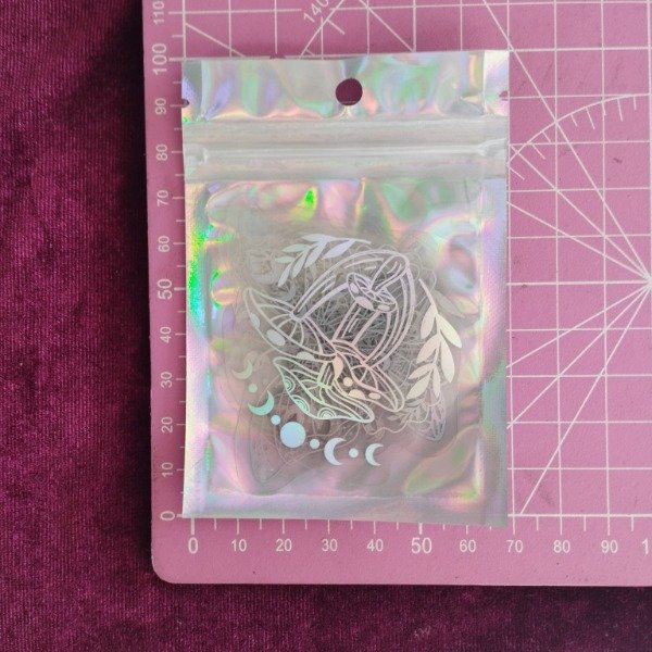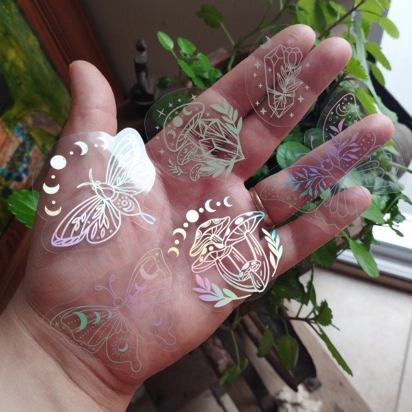 Cinco piezas de stickers holográficos con diseño mágico 🍄🔮✨💎✋