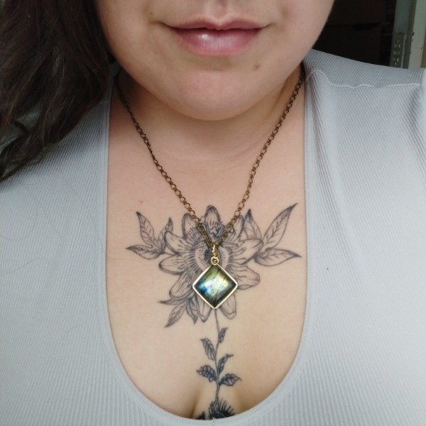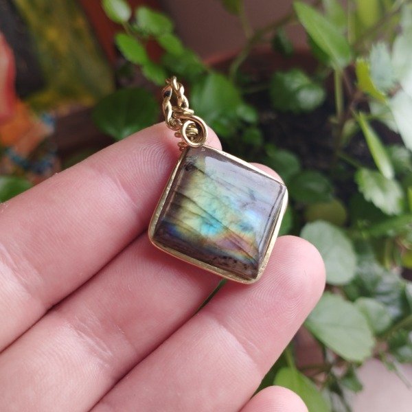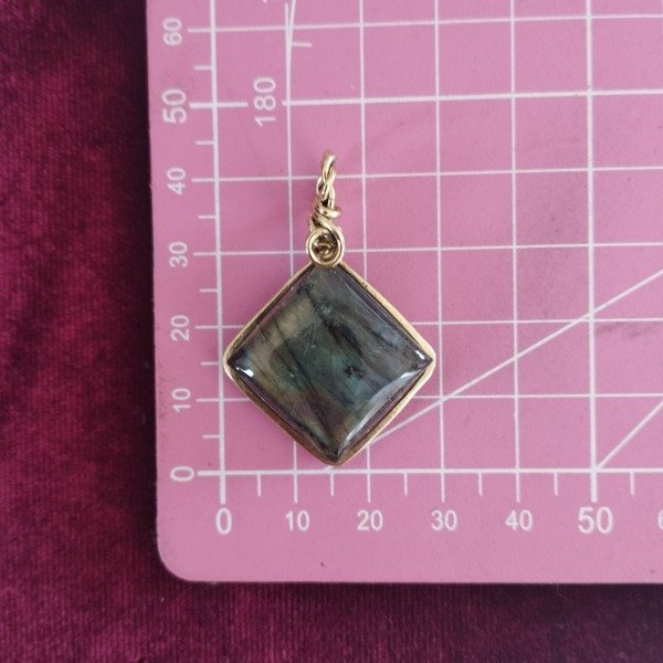 Dije colgante trabajado en metal bronce con piedra natural Labradorita forma rombo ✨